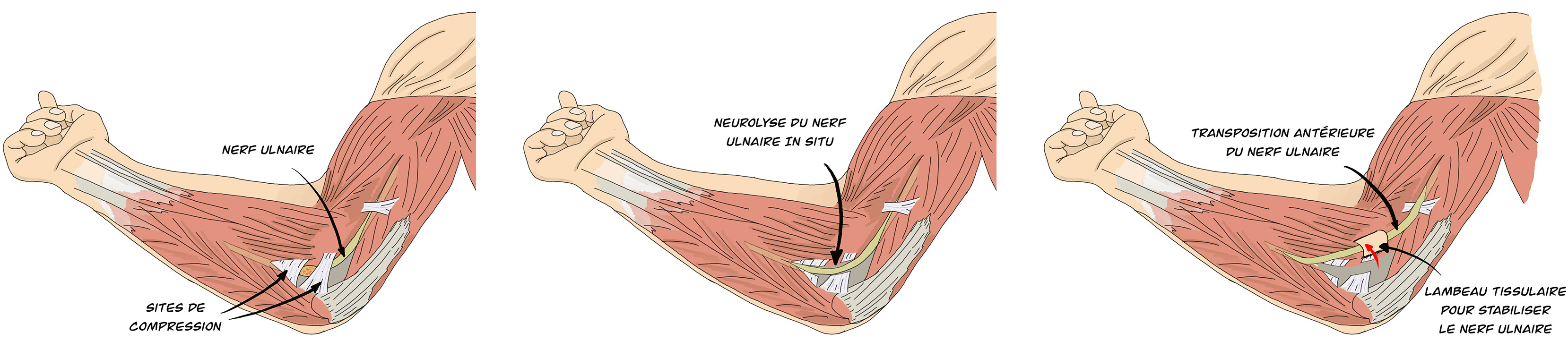 La libération à ciel ouvert du nerf ulnaire au coude est un geste chirurgical bien codifié. Elle permet toujours une stabilisation de l’atteinte observée, souvent une amélioration voire une totale récupération des signes sensitifs. En revanche, les signes moteurs avec amyotrophie font rarement l’objet d’une récupération.